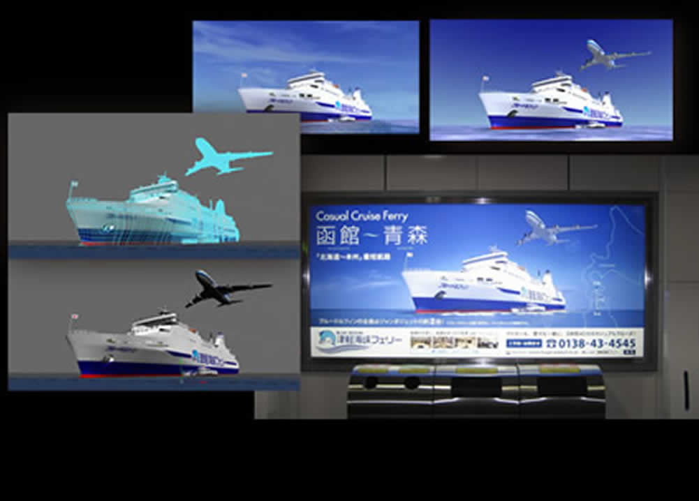 | CG利用先: ポスター・時刻表等印刷物各種 フェリー紹介映像内CGアニメーション素材、屋外看板出力用素材 等 |